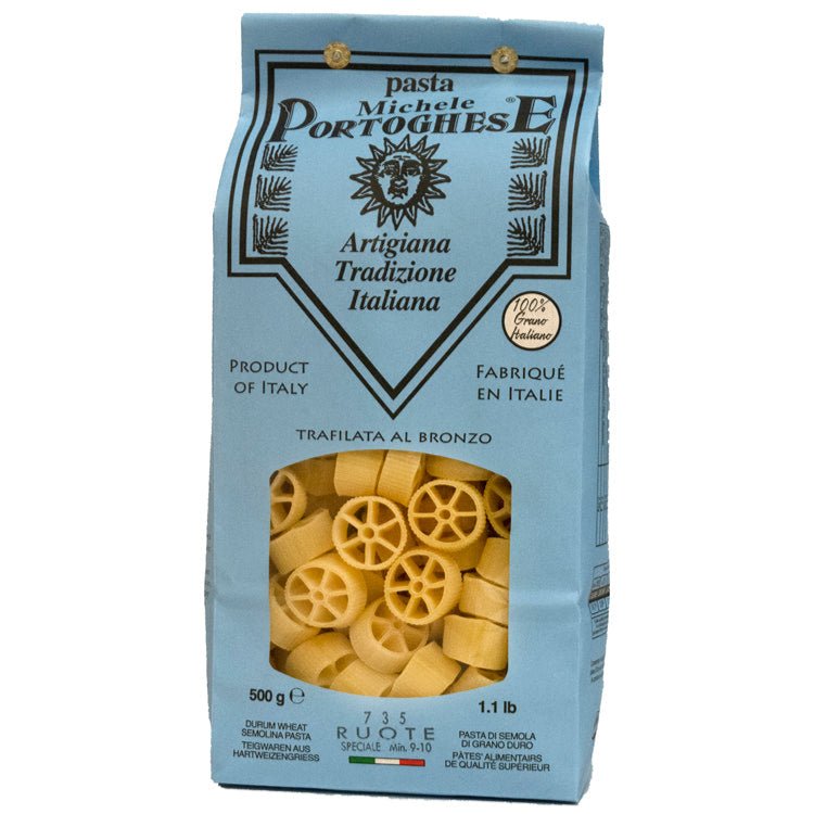 Ruote, a special short pasta, has a round, spoked shape with a ridged exterior reminiscent of a wagon wheel. They can be enjoyed as dry pasta with tomato sauce, with or without meat, but they are also perfect with cream and zucchini or minestrone.